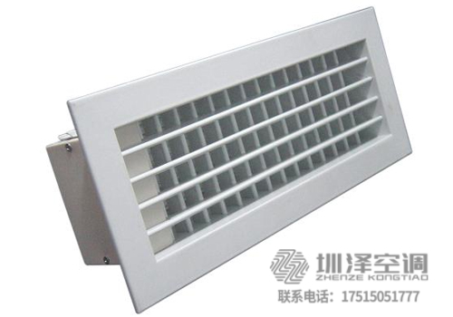 雙層百葉風口由雙層葉片組成,前面一層葉片是可調的,后面一層葉片是固定的,根據需要可配置對開式多葉風量調節閥,用來調節風口風量。凡前面葉片為豎向布置、后面葉片為橫向布置的稱為VH式。通過改變豎葉片的安裝角度,可調整氣流的擴散角。例如,設在賓館客房小過道內的臥式暗裝風機盤管機組的出風口,通常是采用VH式雙層百葉風口的。