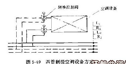 四條管道分別采用冷熱水供應(yīng)管和回水管系統(tǒng)。進(jìn)出水管設(shè)轉(zhuǎn)換控制閥,主要用于全年空調(diào)系統(tǒng),即隨時有冷熱源,冷熱水量由溫控閥調(diào)節(jié)。